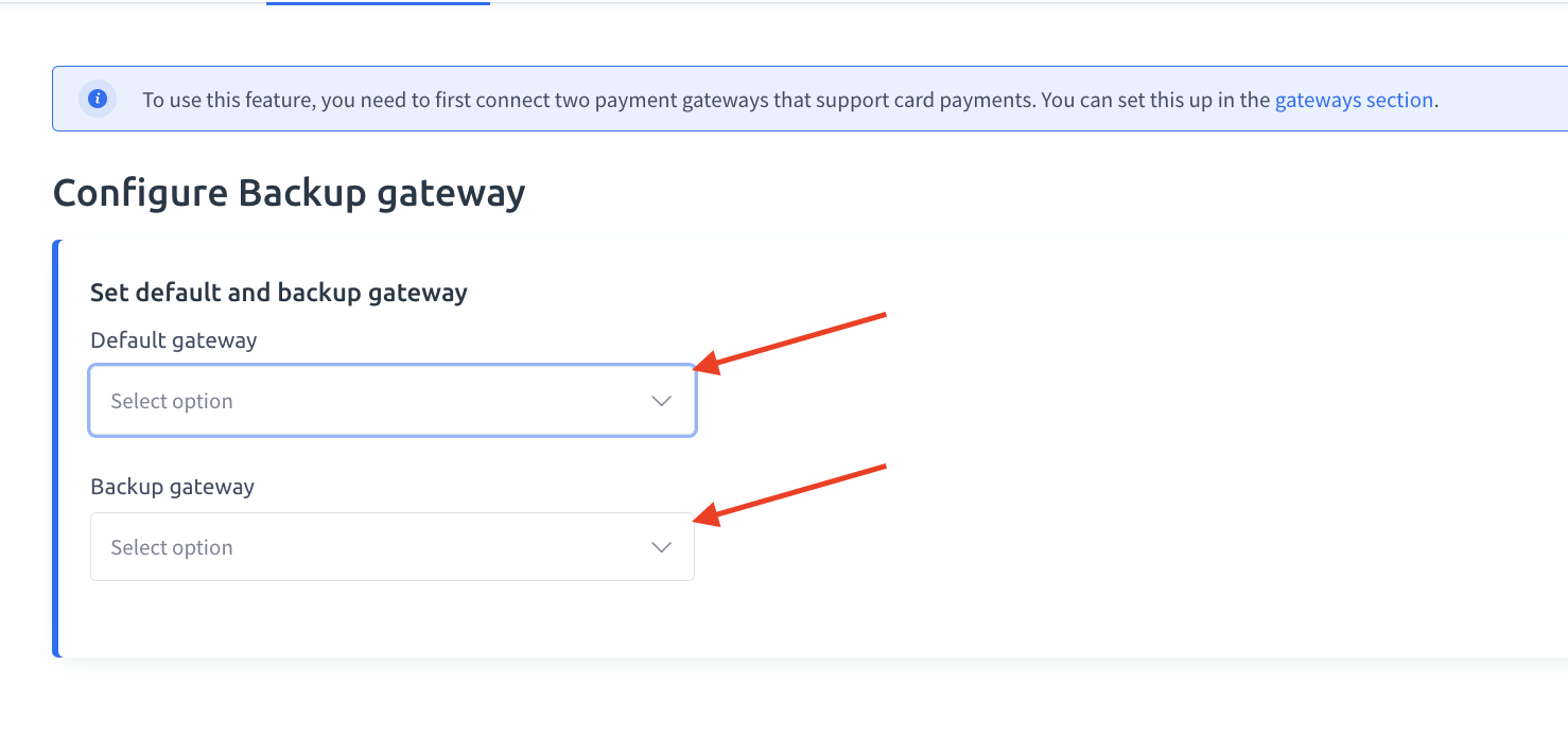 Choose you default gateway and then choose your backup gateway. Then click Save. To use this feature, make sure you first connect two payment gateway options that support card payments such as Payments AI gateway and Stripe.